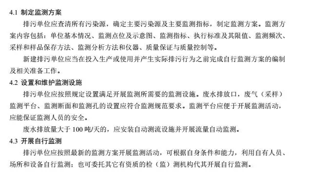一是自行監(jiān)測(cè)的一般要求,即制定監(jiān)測(cè)方案、設(shè)置和維護(hù)監(jiān)測(cè)設(shè)施、開(kāi)展自行監(jiān)測(cè)、做好監(jiān)測(cè)質(zhì)量保證與質(zhì)量控制、記錄保存和公開(kāi)監(jiān)測(cè)數(shù)據(jù)的基本要求;