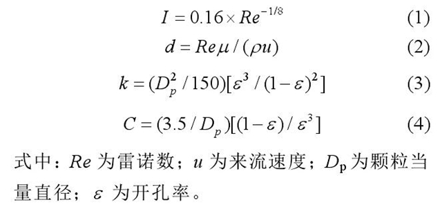 采用分區(qū)劃分網(wǎng)格的方法,對電袋復合除塵器的不同區(qū)域進行前處理。劃分出了4種不同網(wǎng)格數(shù)量,經(jīng)過計算得出1100萬網(wǎng)格與實際出口壓力值做比較接近,出口負壓為2850Pa,湍流強度I和水力直徑d分別見公式(1)和公式(2)。各壁面均設(shè)為無滑移壁面,空氣密度ρ為1.225kg/m3,黏度μ為2.425x10-5kg/m3;濾料的厚度△m=2mm,滲透率k見公式(3),內(nèi)部阻力系數(shù)C'見公式(4)。
