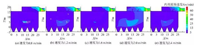 圖2(c)是速度為1.6m/min的云圖,在此工況下,濾袋下部空間的“高速區(qū)”呈帶狀斜向上延伸至濾袋區(qū)后墻出口。在此區(qū)域內(nèi),氣流速度大,氣流量大,本工況,濾袋底部空間最大氣流速度為15m/min,濾袋區(qū)的最大氣流速度在后墻中部濾袋處,為10.3m/min,最小氣流速度在濾袋區(qū)的前端下部,為0.4m/s。速度差值進一步增大。