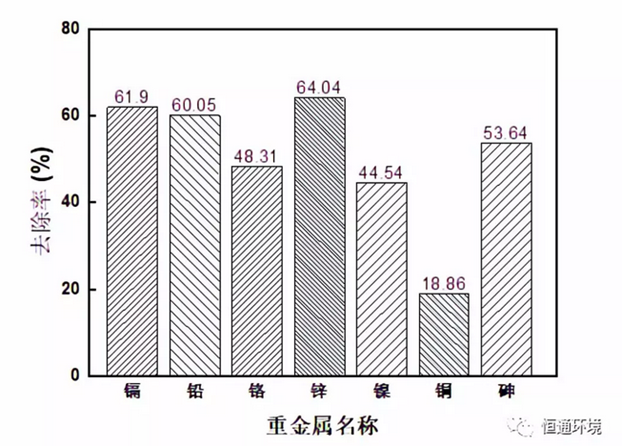 從圖表中可以明顯看出重金屬去除率多數(shù)達(dá)到50%以上,其中鎘和鋅去除率高達(dá)61.9%和64.04%。