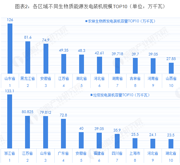 各個區(qū)域發(fā)展側(cè)重點不同,山東農(nóng)林生物質(zhì)發(fā)電規(guī)模第一,浙江垃圾發(fā)電規(guī)模第一