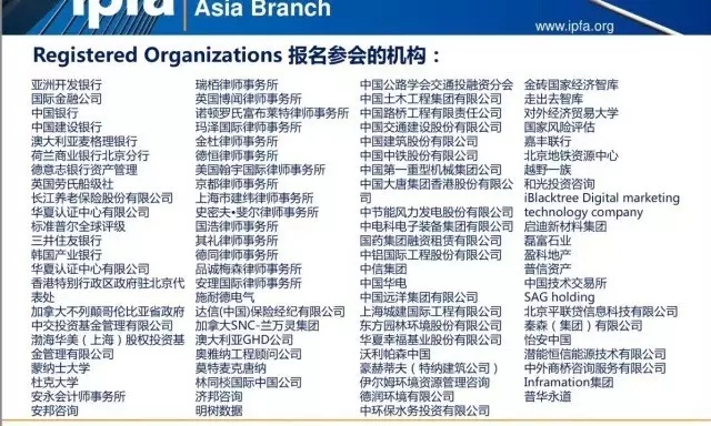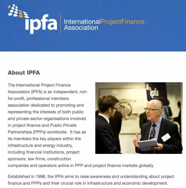 國(guó)際項(xiàng)目融資協(xié)會(huì)(IPFA)是于 1998 年 11 月在倫敦成立的非盈利性國(guó)際機(jī)構(gòu),在全球有超過(guò)600家的機(jī)構(gòu)會(huì)員,是全球最大的聚焦項(xiàng)目融資和PPP的專業(yè)網(wǎng)絡(luò)和交流平臺(tái)。其會(huì)員多是基礎(chǔ)設(shè)施建設(shè)和能源行業(yè)的主要參與者,包括金融機(jī)構(gòu)、項(xiàng)目發(fā)起人、律師事務(wù)所、建筑公司以及從事PPP項(xiàng)目的運(yùn)營(yíng)商。