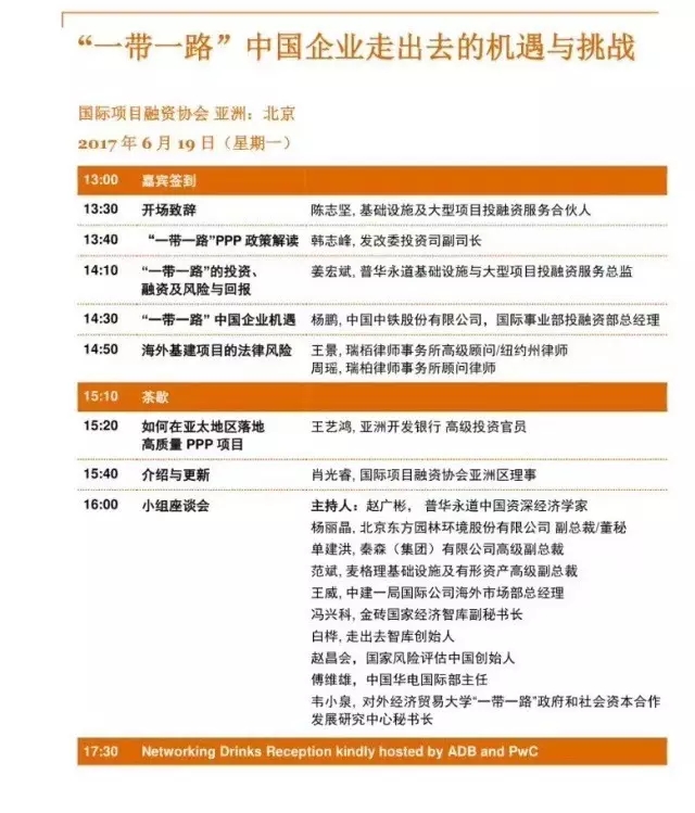 由IPFA的兩個(gè)會(huì)員機(jī)構(gòu)亞洲開發(fā)銀行和普華永道PwC聯(lián)合舉辦,邀請(qǐng)來(lái)自國(guó)家發(fā)展改革委、國(guó)際金融機(jī)構(gòu)、咨詢公司、律師事務(wù)所、智庫(kù)和中國(guó)企業(yè)等嘉賓,共同討論快速發(fā)展的國(guó)內(nèi)PPP市場(chǎng)和激增的走出去需求所帶來(lái)的機(jī)遇和挑戰(zhàn),并向中國(guó)公司提供政策解讀和專業(yè)建議。參加活動(dòng)的發(fā)言嘉賓,個(gè)個(gè)堪稱重量級(jí),如發(fā)改委投資司副司長(zhǎng)韓志鋒,亞行高級(jí)投資官員王藝?guó)櫍杖A永道基礎(chǔ)設(shè)施與大型項(xiàng)目投融資服務(wù)總監(jiān)姜宏斌,中國(guó)中鐵股份公司國(guó)際事業(yè)部投融資部總經(jīng)理?xiàng)铢i等等。