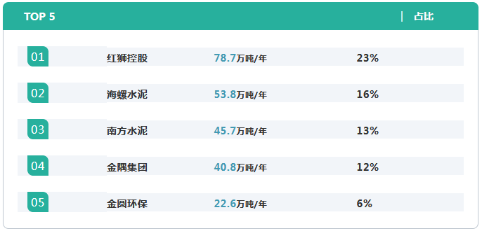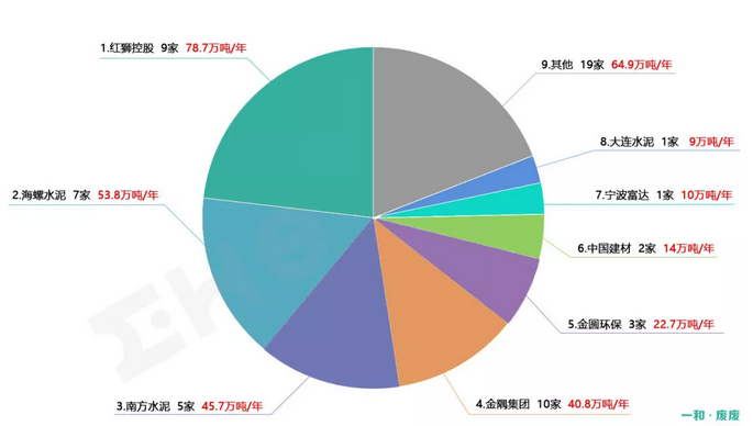 在水泥窯協(xié)同處置危廢上處置能力排名前五的集團(tuán)為紅獅、海螺、南方水泥、金隅和金圓,合計(jì)危廢處置能力占行業(yè)總量的70%。除此之外,華新、中建材、臺(tái)泥等也在推進(jìn)水泥窯協(xié)同項(xiàng)目的發(fā)展,并在積極的往危廢處置方向進(jìn)行改造和擴(kuò)張。部分環(huán)保企業(yè)也敏感的注意到水泥窯協(xié)同處置危廢的優(yōu)勢(shì)及發(fā)展?jié)摿?,積極布局,占有不小的比重。
