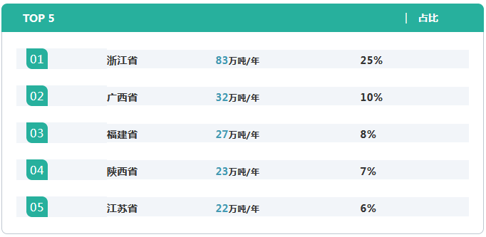 截至2019年4月30日我國(guó)已有20個(gè)省份(或直轄市)存在水泥窯協(xié)同處置危險(xiǎn)廢物的產(chǎn)能,規(guī)模前五名的省份為浙江、廣西、福建、陜西和江蘇,合計(jì)規(guī)模占全國(guó)總量56%。