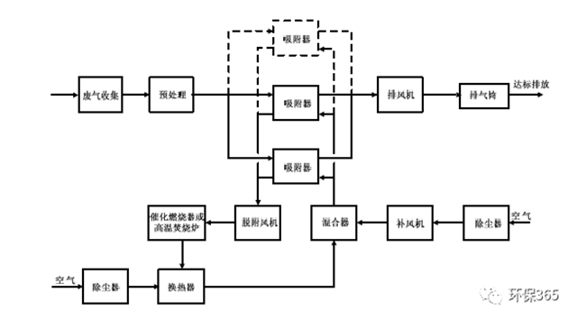 當(dāng)廢氣中的有機(jī)物不宜回收時(shí),宜采用熱氣流再生工藝。脫附產(chǎn)生的高濃度有機(jī)氣體采用催化燃燒或高溫焚燒工藝進(jìn)行銷(xiāo)毀。