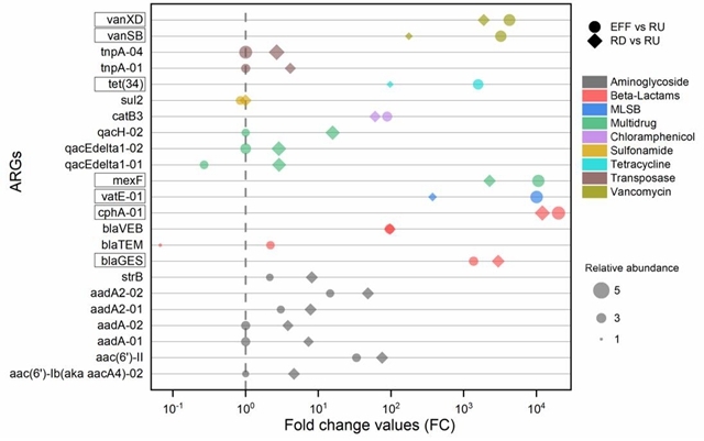 先前的研究表明,垃圾滲濾液中含有大量ARGs,而含有ARGs的出水的排放將導(dǎo)致ARGs不斷進(jìn)入環(huán)境。然而,關(guān)于垃圾滲濾液處理廠處理后出水對(duì)接收河流中的ARG豐度和組成影響的研究還很少,同時(shí),出水排放引入的ARGs的種類以及富集情況仍不清楚。