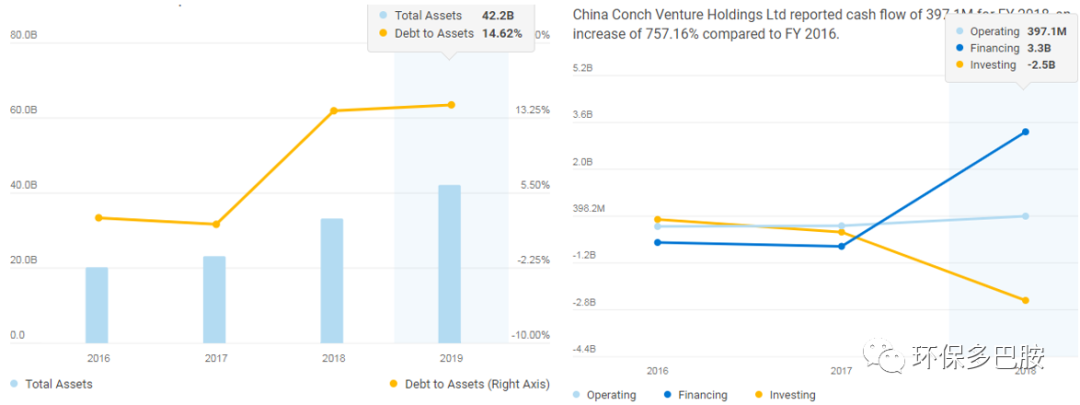 正是出身于這樣一個(gè)大家庭,公司成立之初,不僅繼承了海螺良好的管理團(tuán)隊(duì)和文化,同時(shí),海螺水泥優(yōu)秀的財(cái)務(wù)表現(xiàn)還使得公司享受穩(wěn)定投資收益和分紅,擁有殷實(shí)財(cái)務(wù)報(bào)表(低負(fù)債、高回款和充足現(xiàn)金),可以說是在環(huán)保行業(yè)中是別具一格的富二代,這二者為海螺創(chuàng)業(yè)日后的成功奠定了扎實(shí)的基礎(chǔ)。