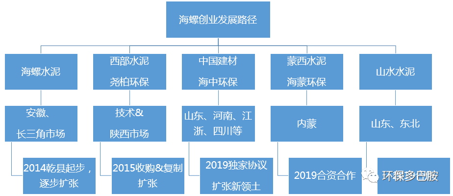 由于水泥行業(yè)市場(chǎng)格局較為固定,為了進(jìn)入海螺集團(tuán)影響力較小地區(qū)(海螺主要輻射安徽及長(zhǎng)三角地區(qū)),則必須與其他水泥企業(yè)合作。2019年伴隨海創(chuàng)在水泥窯協(xié)同方面技術(shù)的成熟與管理的優(yōu)勢(shì),公司有了將潛在對(duì)手變成合作伙伴的資本,從而開啟全國(guó)異地?cái)U(kuò)張節(jié)奏!