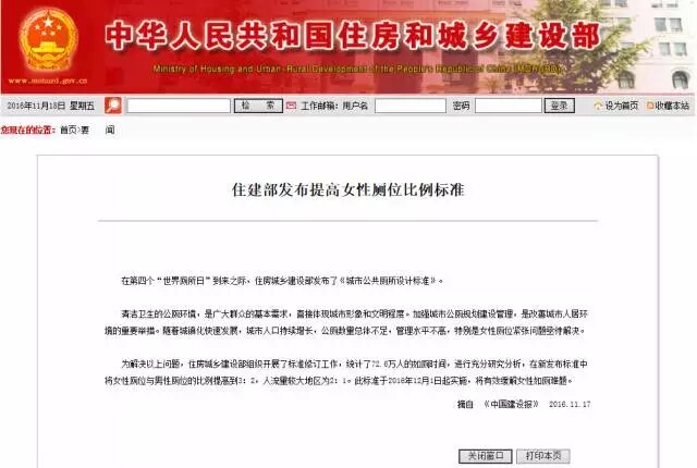在第四個“世界廁所日”到來之際,住建部網(wǎng)站發(fā)布新標(biāo)準(zhǔn),將女性廁位與男性廁位比例提高到3:2,人流量較大地區(qū)為2:1,以緩解女性廁位緊張的問題。此標(biāo)準(zhǔn)將于今年12月1日起實(shí)施。