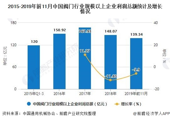 2015-2017年,我國閥門行業(yè)規(guī)模以上企業(yè)主營收入規(guī)模持續(xù)上升,2017年達到2486.3億元,同比增長8.17%,達到近5年來最高;2018-2019年,受到貿易戰(zhàn)影響,國際市場受阻,2019年1-11月,我國閥門行業(yè)柜上企業(yè)實現(xiàn)主營收入1788.23億元,雖然營收持續(xù)下滑,但增速出現(xiàn)回升趨勢。