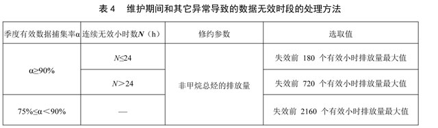 11.2.4 NMHC-CEMS有計(jì)劃(質(zhì)量保證/質(zhì)量控制)的維護(hù)保養(yǎng)、校準(zhǔn)及其它異常導(dǎo)致的數(shù)據(jù)無(wú)效時(shí)段,該時(shí)段污染物排放量按照表4處理,非甲烷總烴濃度和廢氣參數(shù)不修約。