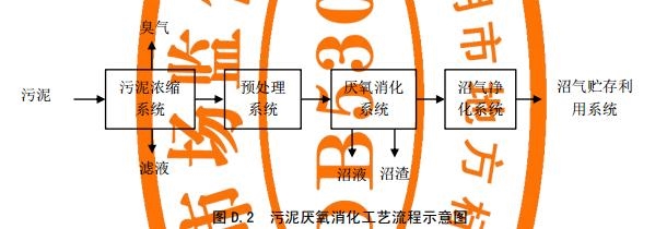 污泥脫水產(chǎn)生的主要污染物是污泥濃縮和污泥脫水工段產(chǎn)生的廢水和廢氣,廢水中包括污泥濃縮脫水過程中產(chǎn)生的上清液和濾液(包括沖洗水),廢氣是集泥池、濃縮池和脫水機(jī)房產(chǎn)生的惡臭。污泥厭氧消化工藝流程示意見圖D.2。