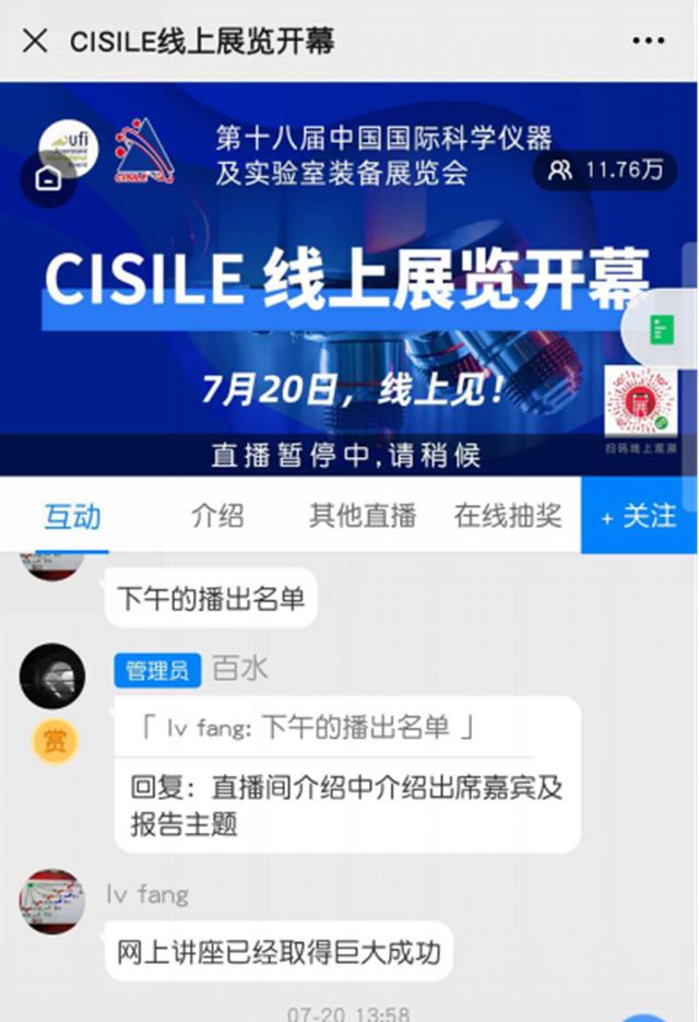 截至2020年7月20日14:00,線上直播活動(dòng)CISILE直播入口觀看人次超過11萬,未計(jì)入中國化工儀器網(wǎng)、分析測試百科網(wǎng)的轉(zhuǎn)播觀看人次。