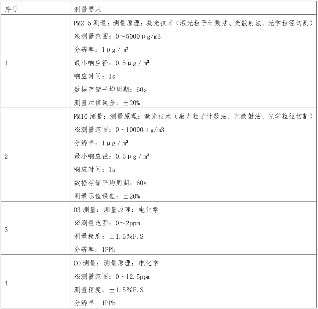 該項目需環(huán)境空氣網(wǎng)格化監(jiān)測系統(tǒng),集成 PM2.5、PM10、O3、CO、SO2、NO2、TVOC、濕度、溫度、風速、風向在線監(jiān)測儀、數(shù)據(jù)采集等技術為一體的智能監(jiān)測終端,主要用于環(huán)境空氣質量的在線實時自動監(jiān)控。執(zhí)行標準為生態(tài)環(huán)境部技術指南、GB3095-2012、GB/T6167、GB/T35273-2017《地面氣象觀測規(guī)范》。