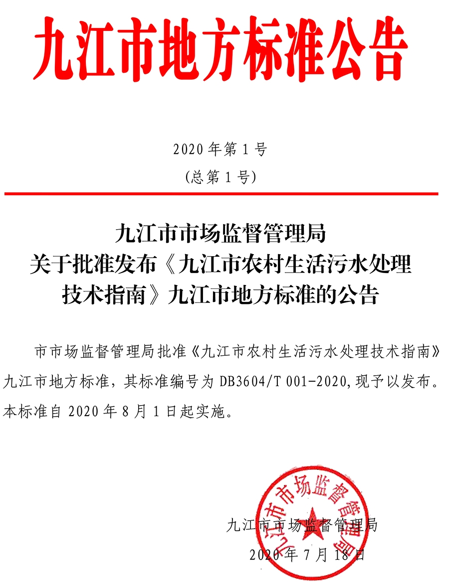 九江市市場監(jiān)督管理局關(guān)于批準(zhǔn)發(fā)布《九江市農(nóng)村生活污水處理技術(shù)指南》九江市地方標(biāo)準(zhǔn)的公告