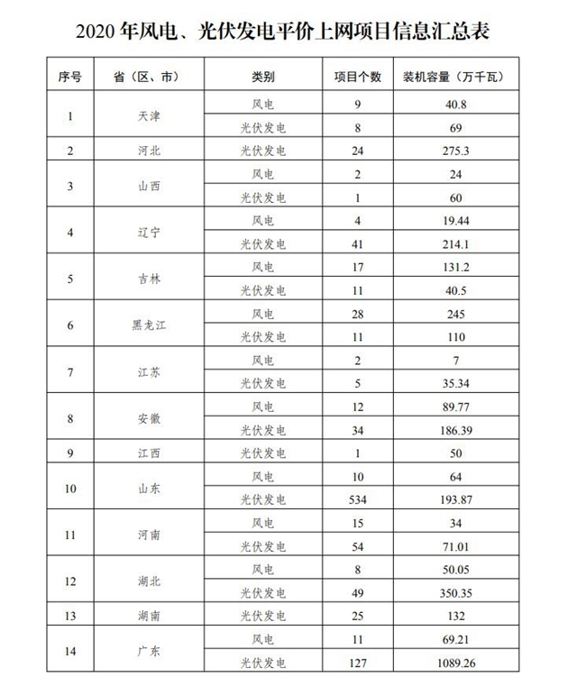 國家發(fā)展改革委辦公廳 國家能源局綜合司關(guān)于公布2020年風(fēng)電、光伏發(fā)電平價(jià)上網(wǎng)項(xiàng)目的通知