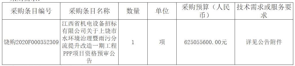 江西省機電設備招標有限公司關于上饒市水環(huán)境治理暨雨污分流提升改造一期工程PPP項目公開招標公告