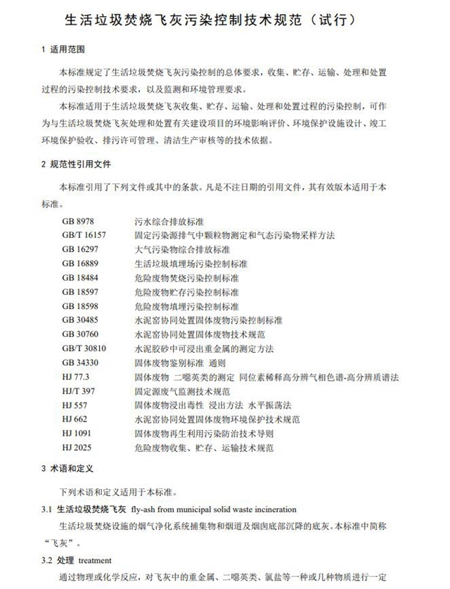 近日,生態(tài)環(huán)境部發(fā)布《生活垃圾焚燒飛灰污染控制技術(shù)規(guī)范(試行)》,其中規(guī)范和指導(dǎo)生活垃圾焚燒飛灰的環(huán)境管理,本標(biāo)準(zhǔn)規(guī)定了生活垃圾焚燒飛灰收集、貯存、運(yùn)輸、處理和處置過程的污染控制技術(shù)要求。