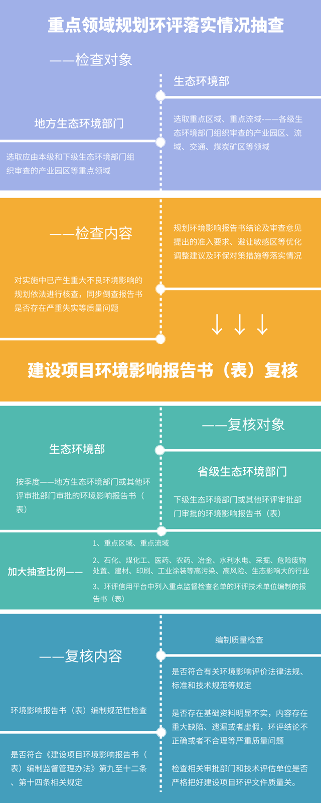 重點(diǎn)領(lǐng)域規(guī)劃環(huán)評落實(shí)情況抽查、建設(shè)項(xiàng)目環(huán)境影響報告書(表)復(fù)核、建設(shè)項(xiàng)目環(huán)評文件及批復(fù)要求落實(shí)情況抽查、固定污染源排污許可證核發(fā)情況抽查、固定污染源排污許可證執(zhí)行情況抽查
