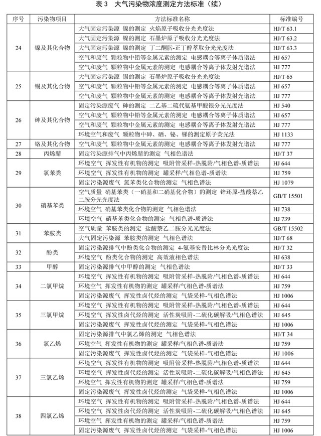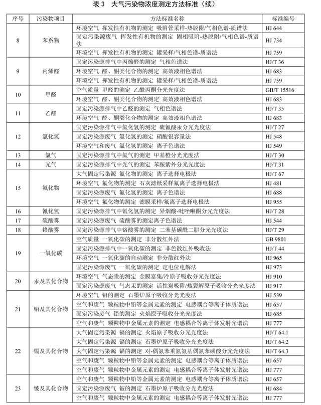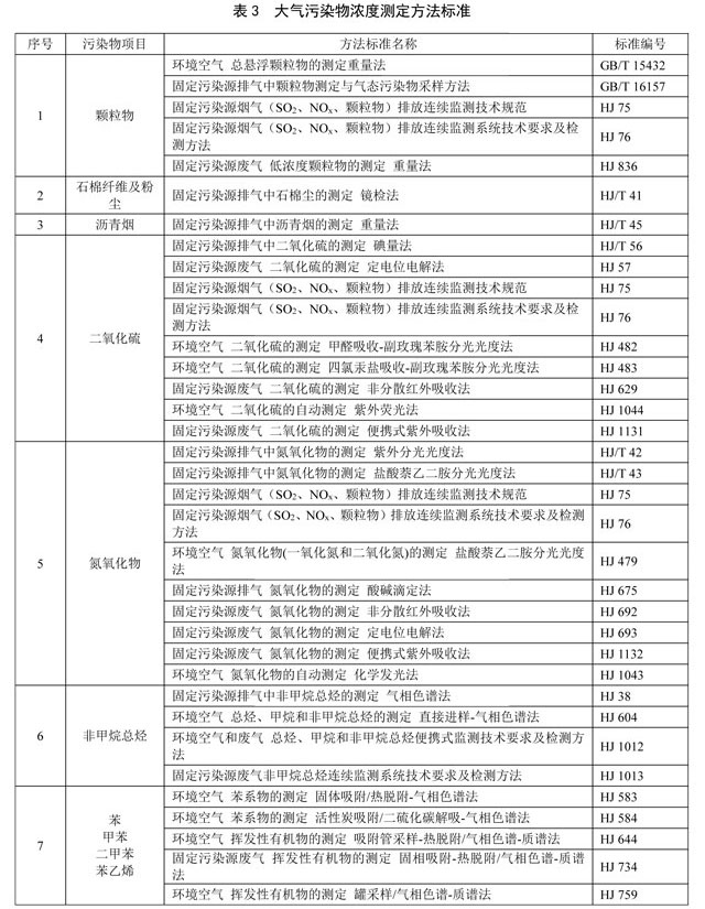 5.6 對(duì)大氣污染物排放濃度的測(cè)定采用表3所列的方法標(biāo)準(zhǔn)。本標(biāo)準(zhǔn)發(fā)布實(shí)施后,有新發(fā)布的國(guó)家環(huán)境監(jiān)測(cè)分析方法標(biāo)準(zhǔn),其方法適用范圍相同的,也適用于本標(biāo)準(zhǔn)對(duì)應(yīng)污染物的測(cè)定。