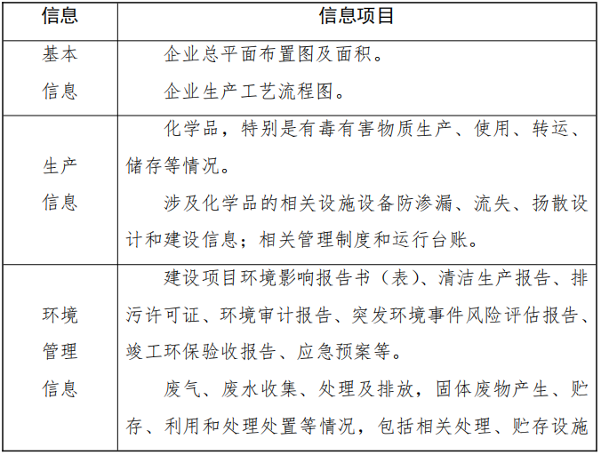 重點收集企業(yè)基本信息、生產(chǎn)信息、環(huán)境管理信息等(包括但不限于表1列舉的資料清單),并梳理企業(yè)有毒有害物質(zhì)信息清單。