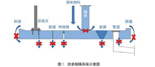 防滲阻隔系統(tǒng)被認為是最有效的土壤污染預(yù)防設(shè)施。僅僅使用抗?jié)B材質(zhì)并不能達到防滲阻隔系統(tǒng)要求。防滲阻隔系統(tǒng)是包括地基、路面、墻體、水池、排水系統(tǒng)(包括地基、管道、連接處)等由特定建筑材料構(gòu)成的系統(tǒng)抗?jié)B工程,共同保證有毒有害物質(zhì)不會滲入系統(tǒng)的另一側(cè),例如符合要求的防滲地板、防滲池、土工膜等。圖1為防滲阻隔系統(tǒng)的示意圖。防滴漏設(shè)施屬于一種防滲阻隔系統(tǒng),特點是可移動。