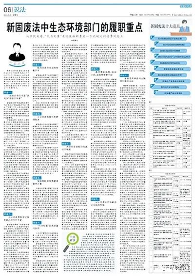 圖為中國(guó)環(huán)境報(bào)報(bào)2020年9月4日六版,對(duì)新固廢法中生態(tài)環(huán)境部門的履職重點(diǎn)進(jìn)行了梳理和解讀。