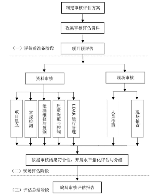 對企業(yè)揮發(fā)性有機(jī)物泄漏檢測與修復(fù)(LDAR)項目進(jìn)行審核評估的方法流程,審核評估形式及要素,審核評估過程,水平量化評分標(biāo)準(zhǔn),現(xiàn)場抽查方法與規(guī)則,審核評估報告大綱等內(nèi)容及要求。
