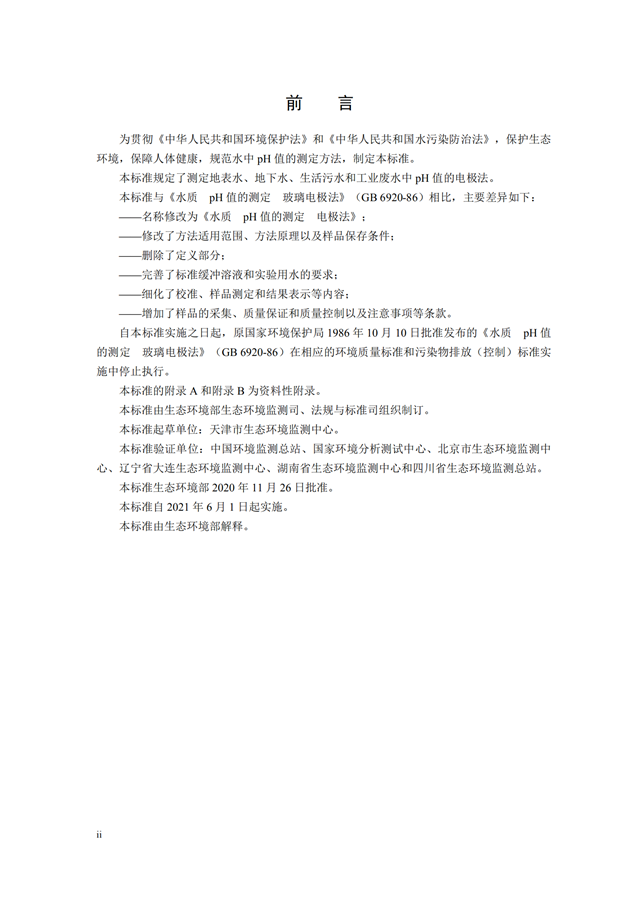 為貫徹《中華人民共和國環(huán)境保護(hù)法》,保護(hù)生態(tài)環(huán)境,保障人體健康,規(guī)范生態(tài)環(huán)境監(jiān)測工作,現(xiàn)批準(zhǔn)《水質(zhì) pH值的測定 電極法》為國家環(huán)境保護(hù)標(biāo)準(zhǔn),并予發(fā)布。