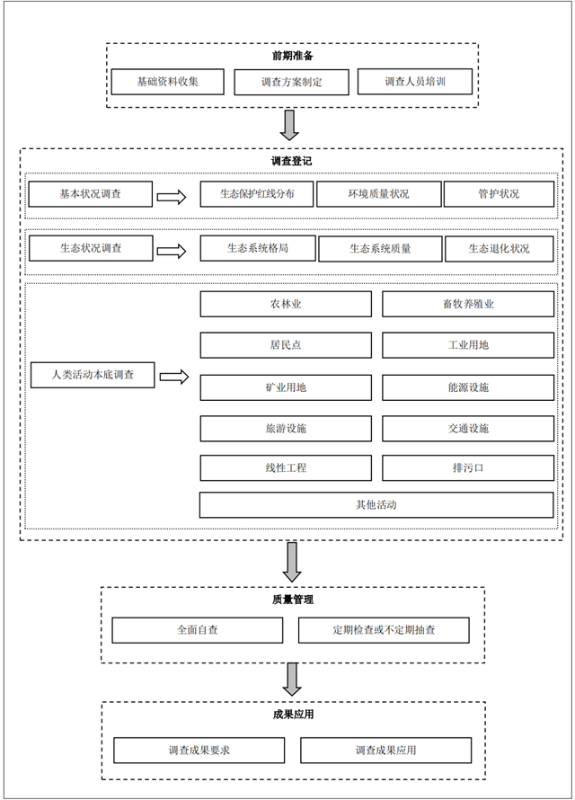 指為滿足生態(tài)保護(hù)紅線監(jiān)管需求,對(duì)生態(tài)保護(hù)紅線基本狀況、生態(tài)狀況、人類活動(dòng)本底情況和 其他相關(guān)基礎(chǔ)信息進(jìn)行的調(diào)查統(tǒng)計(jì)。調(diào)查工作主要通過現(xiàn)場(chǎng)調(diào)查、遙感監(jiān)測(cè)、資料收集等技術(shù)手段 開展,以縣級(jí)行政區(qū)為基本單元進(jìn)行匯總。