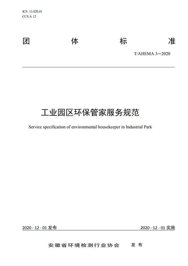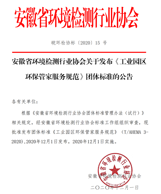 根據(jù)《安徽省環(huán)境檢測行業(yè)協(xié)會團體標準管理辦法(試行)》 相關規(guī)定,經(jīng)安徽省環(huán)境檢測行業(yè)協(xié)會標準工作組組織審查,現(xiàn)批準發(fā)布團體標準《工業(yè)園區(qū)環(huán)保管家服務規(guī)范》(T/AHEMA 3-2020),2020年12月1日發(fā)布,2020年12月1日實施。