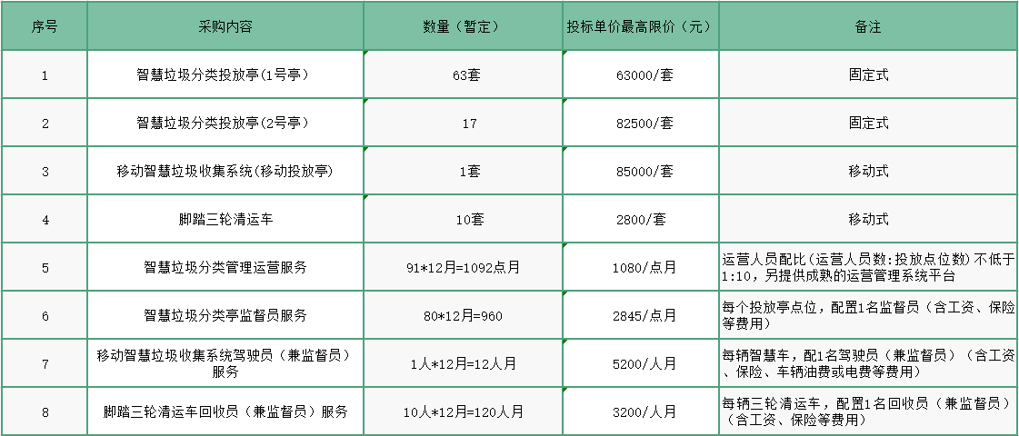 本次東陽(yáng)影視中標(biāo)的白云街道智慧垃圾分類系統(tǒng)及運(yùn)營(yíng)服務(wù)項(xiàng)目在招標(biāo)時(shí)確定的需求如表所示: