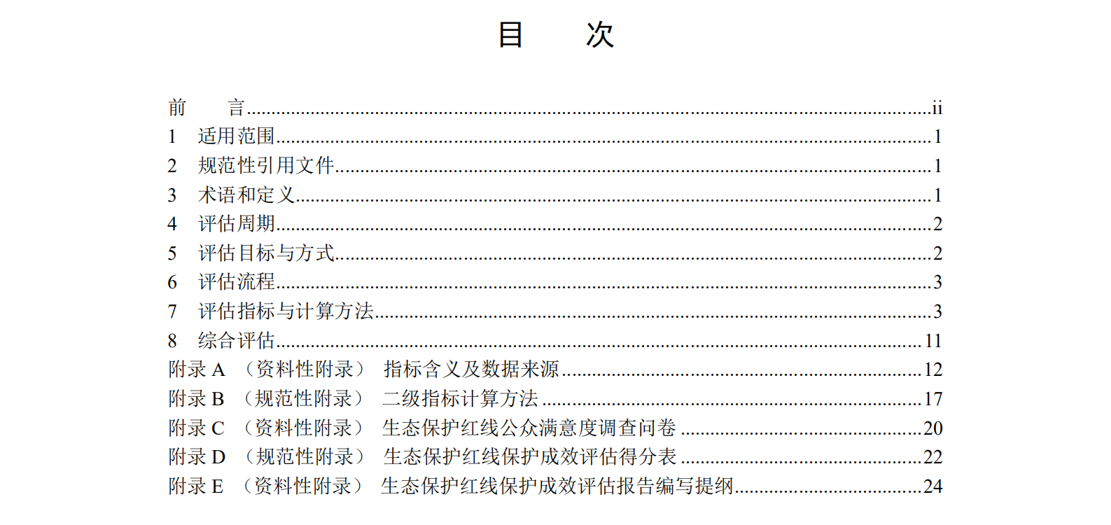 為貫徹落實《中華人民共和國環(huán)境保護法》《中共中央辦公廳 國務(wù)院辦公廳關(guān)于劃定并嚴守生態(tài)保護紅線的若干意見》要求,規(guī)范生態(tài)保護紅線保護成效評估的技術(shù)要求,制定本標準。本標準規(guī)定了生態(tài)保護紅線保護成效評估的評估周期、評估目標與方式、評估指標與計算方法、綜合指數(shù)計算方法與分級標準的具體要求。本標準附錄 A、C、E 為資料性附錄,附錄 B、D 為規(guī)范性附錄。本標準為首次發(fā)布。