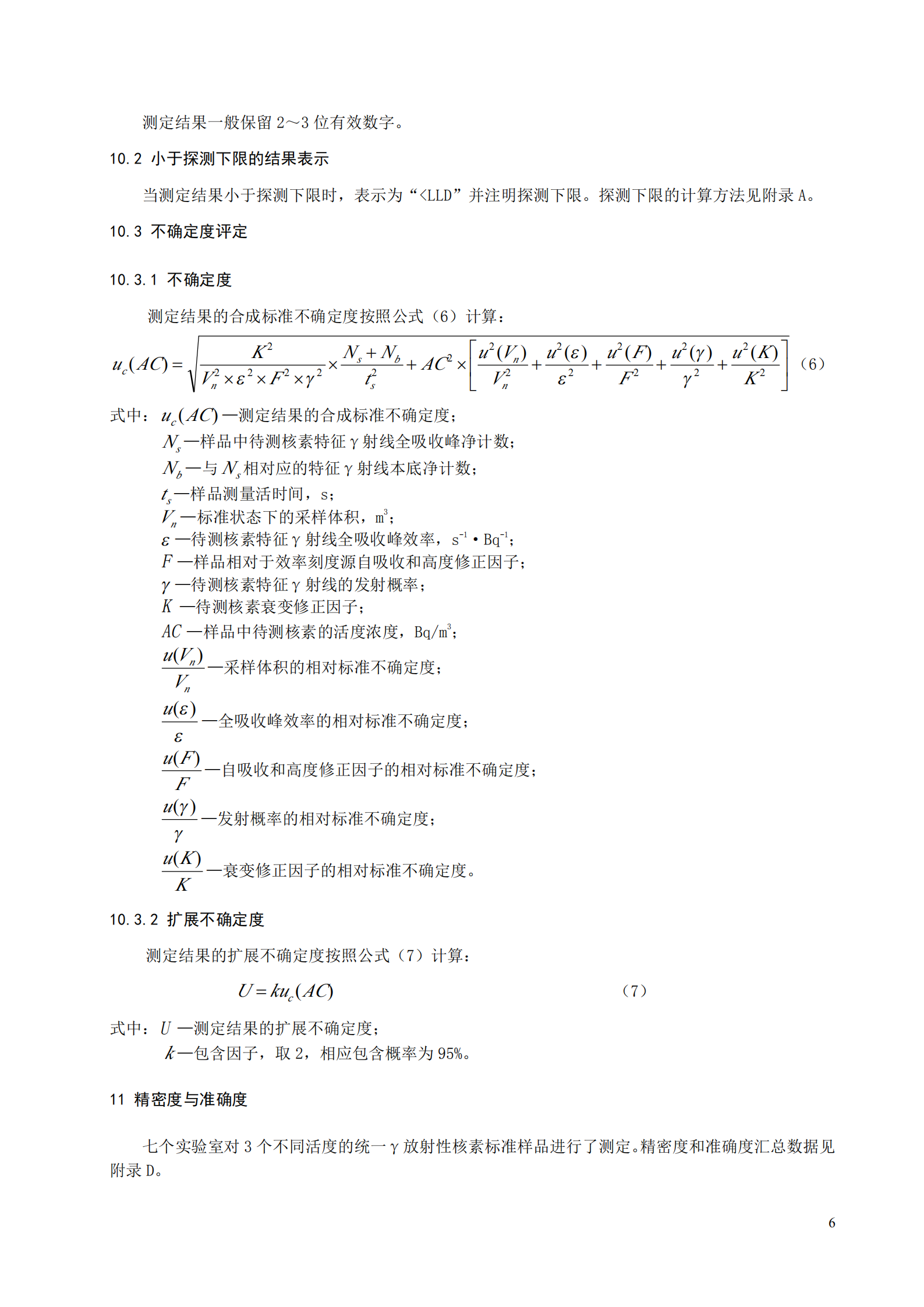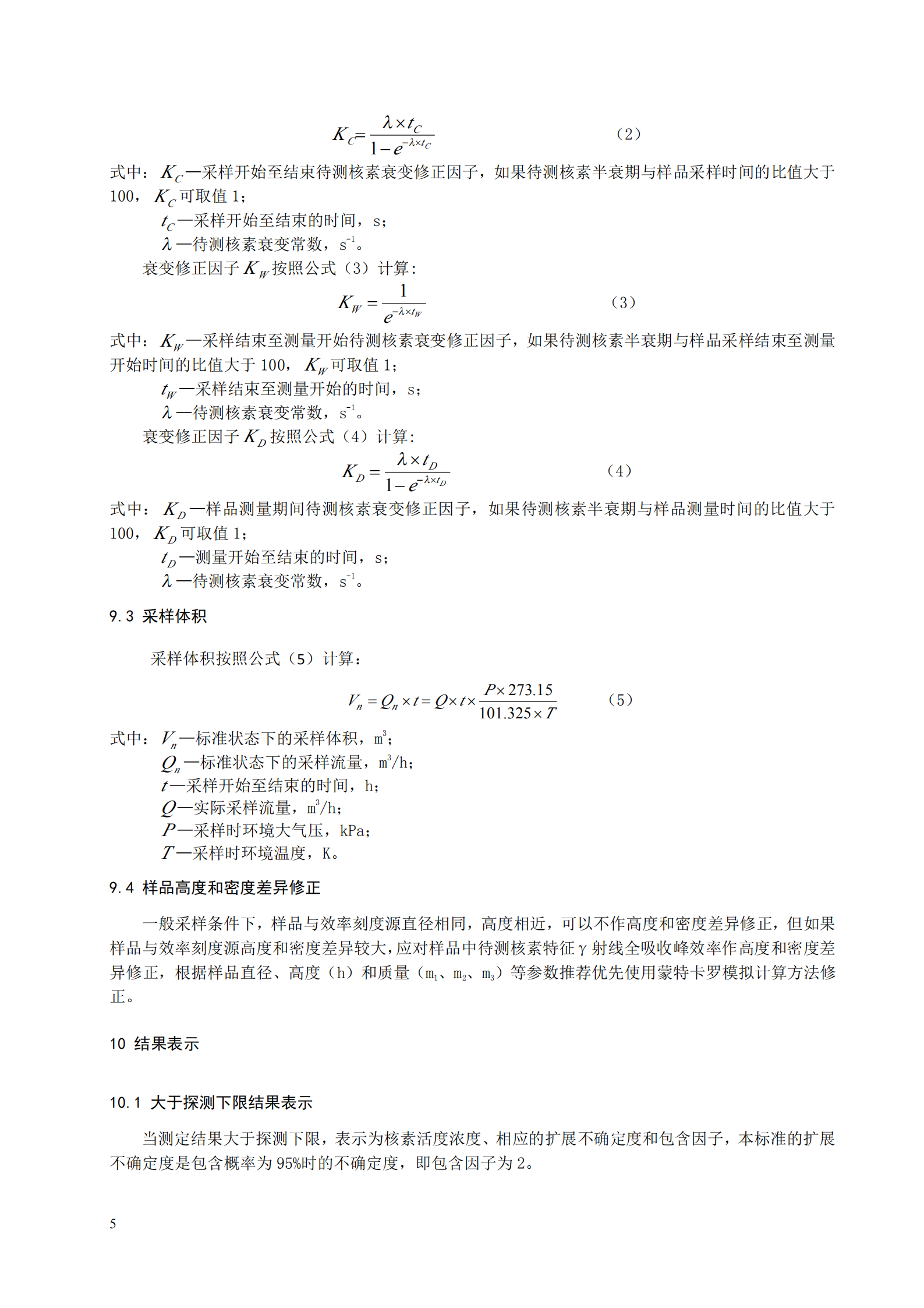 當(dāng)采樣體積為 10000 m 3(標(biāo)準(zhǔn)狀態(tài)),測量時間為 24 小時時,本標(biāo)準(zhǔn)測定的各γ放射性核素探測 下限為 5μBq/m 3~100μBq/m 3,探測下限見附錄 A。