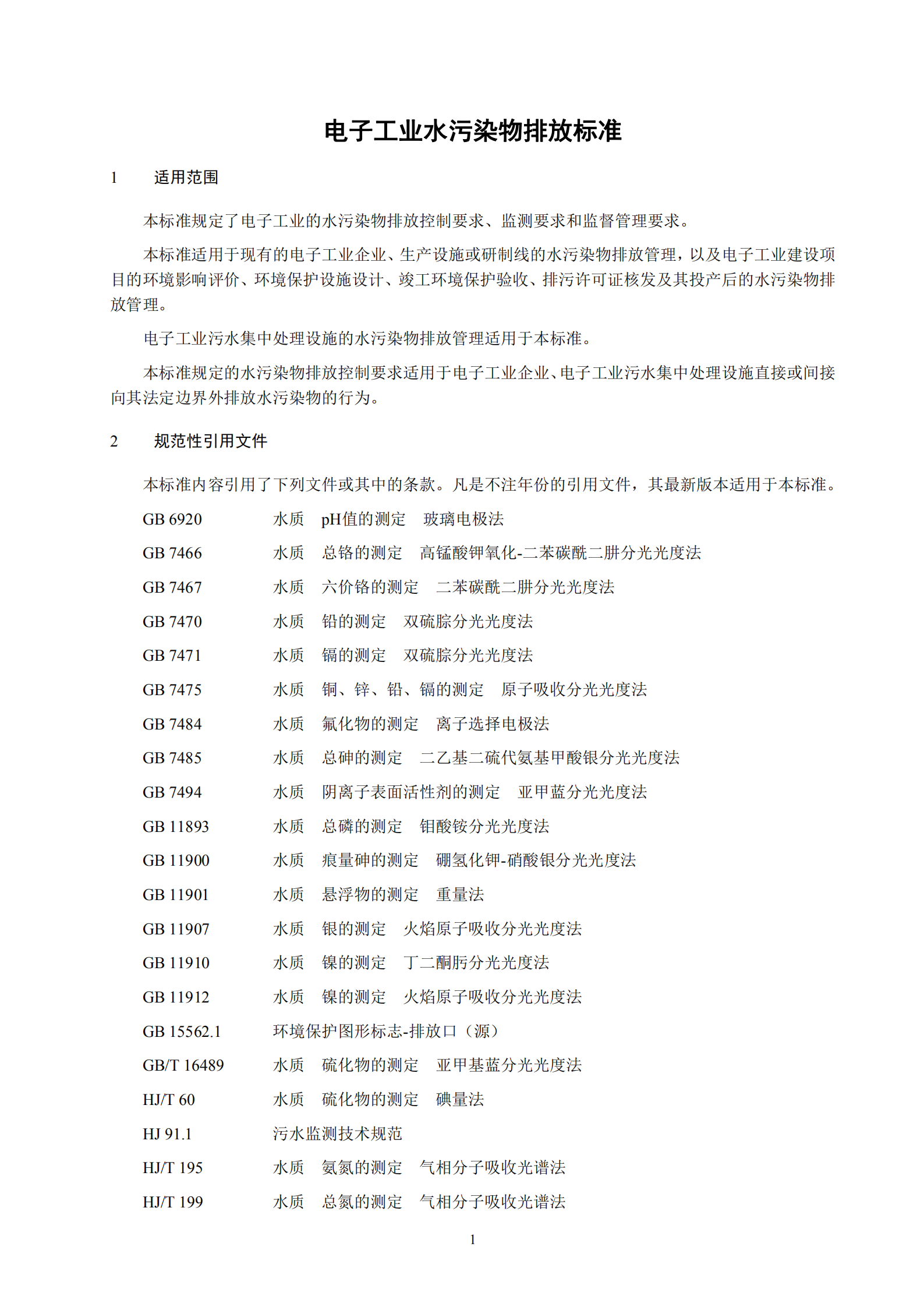 本標準規(guī)定了電子工業(yè)企業(yè)、生產(chǎn)設(shè)施或研制線的水污染物排放控制要求,監(jiān)測要求和監(jiān)督管理要求。電子工業(yè)污水集中處理設(shè)施的水污染物排放管理也適用于本標準。