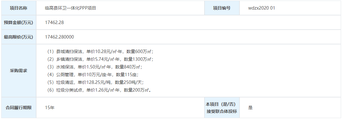臨高縣環(huán)衛(wèi)一體化PPP項(xiàng)目于2020年12月4日發(fā)布采購需求公告,采購預(yù)算金額17462.28萬元/年,項(xiàng)目采用PPP合作模式,合作周期15年,項(xiàng)目總金額預(yù)計(jì)261934.2萬元