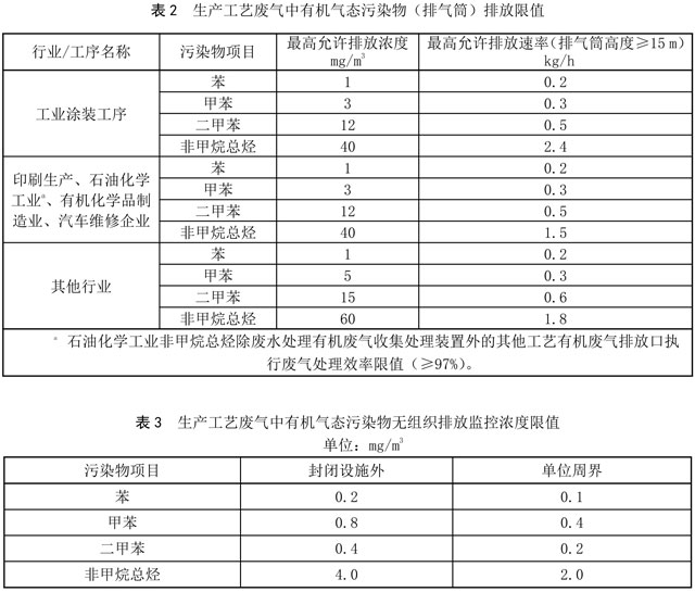 5.2.2 生產工藝廢氣中有機氣態(tài)污染物排氣筒、無組織排放監(jiān)控濃度限值分別按表2、表3的規(guī)定執(zhí)行。