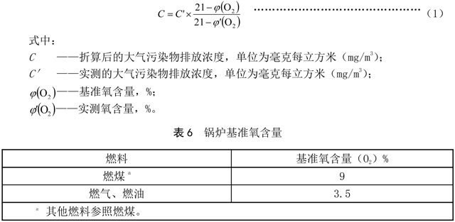 鍋爐和生活垃圾焚燒爐煙氣中二氧化硫、氮氧化物、顆粒物監(jiān)測時,應同時監(jiān)測煙氣氧含量,并按公式(1)換算為基準氧含量排放濃度,以此作為排放是否達標的判斷依據(jù)。若國家相關標準對鍋爐基準氧含量或基準排氣量有規(guī)定的,按照國家相關標準的規(guī)定執(zhí)行;若沒有規(guī)定的,基準氧含量按表6的規(guī)定執(zhí)行。生活垃圾焚燒爐基準氧含量按11%執(zhí)行。