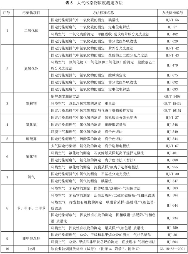 大氣污染物排放濃度測定采用表5所列的方法標準或國家主管部門認定的等效方法執(zhí)行。