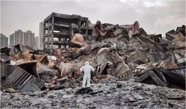 為照顧當(dāng)?shù)氐膭?dòng)物依然住在福島的中村先生這個(gè)是在福島目前生活的唯一的日本人——中村先生,他是全世界輻射量最高的人之一??赡鼙炔涣饲袪栔Z貝利,但他是日本最高的。我為了取得他的信任,跟他住了兩天,通過手機(jī)免提翻譯來采訪他。他非常信任我,他告訴我說你在我這沒有問題,但如果你被核輻射以后的所有后果我不承擔(dān)責(zé)任。這個(gè)老人現(xiàn)在一直在日本這個(gè)地方照顧動(dòng)物,我看到他跟動(dòng)物在一起的時(shí)候,我覺得他跟動(dòng)物那種情感、那種自然是無與倫比的。2015.8·12 天津?yàn)I海新區(qū)爆炸事故該照片獲得“荷賽”一般新聞?lì)悊畏髌啡泉?jiǎng)當(dāng)然作為記者,我們有很多不能言說的東西,有很多報(bào)道的禁區(qū),我們是怎么去應(yīng)對的呢?天津大爆炸這張照片大家可能知道,(獲得了)今年的荷賽獎(jiǎng),包括一些國內(nèi)的大獎(jiǎng)。這是我第三天去拍的一張照片。