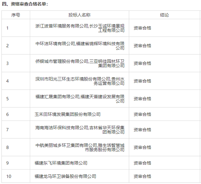 據(jù)了解,該項(xiàng)目招標(biāo)過程中吸引了多家環(huán)衛(wèi)龍頭企業(yè)競標(biāo),在1月4日的資格審查結(jié)果公告中,共有10家(含7個聯(lián)合體)通過資格審查,資格審查合格名單如下: