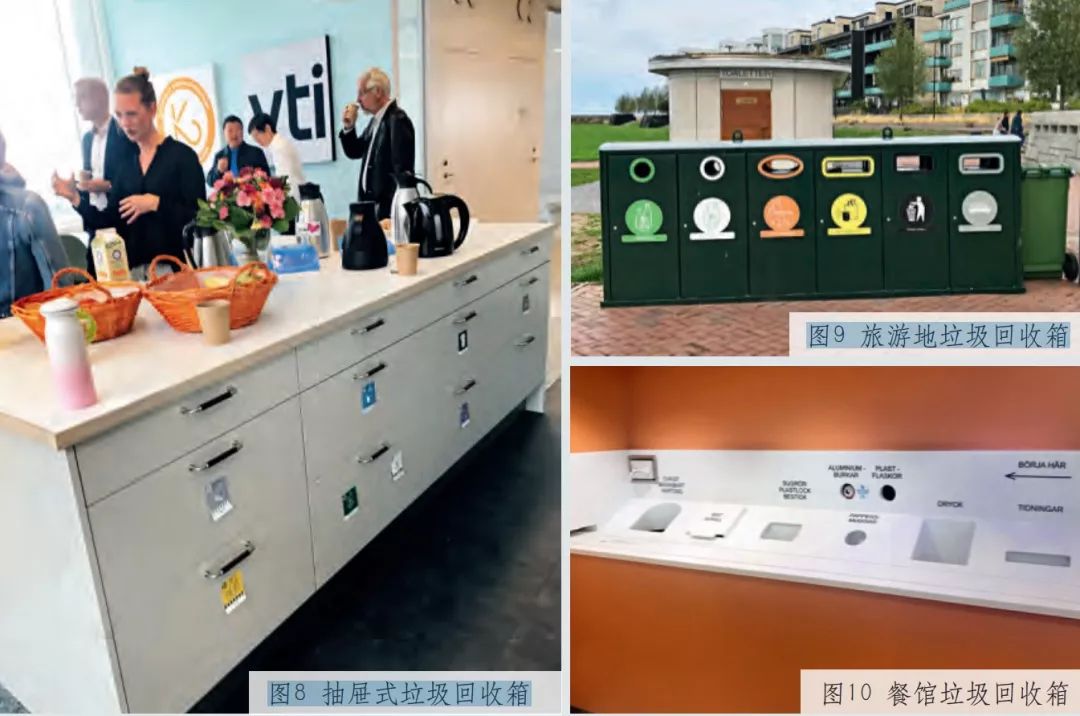 除了分類垃圾箱外,瑞典街道上還設(shè)置了具有壓縮功能的垃圾箱,并在小區(qū)通過以上展示的部分垃圾分類設(shè)施,反映出瑞典人對垃圾分類嚴(yán)謹(jǐn)認(rèn)真的精神、以人為本的理念、簡潔適用的設(shè)計(jì)原則。瑞典的垃圾分類設(shè)施不完全由政府配備,單位和機(jī)構(gòu)也可自行設(shè)置,且各具特點(diǎn),已成為城市一景。