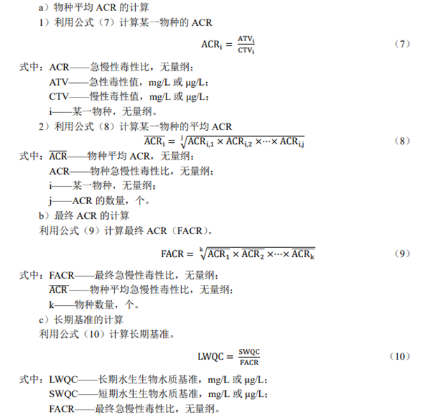 c)當慢性毒性數(shù)據(jù)不足時,可采用急慢性毒性比(ACR)方法推導長期基準。應用 ACR方法至少需要3個動物物種(1 種魚類、1 種水生無脊椎動物、任1種其他水生動物)的急、慢性毒性數(shù)據(jù),每一個物種的急、慢性毒性數(shù)據(jù)應來自同一個實驗室。當獲得的用于計算ACR的所有急、慢性毒性數(shù)據(jù)來自同一篇文獻時,需補充測試至少1種水生脊椎動物和1種水生無脊椎動物的急、慢性毒性數(shù)據(jù)用于計算 ACR。
