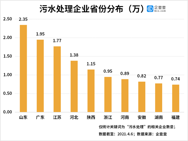 從地域分布來(lái)看,企查查數(shù)據(jù)顯示,山東省的污水處理相關(guān)企業(yè)數(shù)量最多,達(dá)2.35萬(wàn)家。排名2-5位的廣東、江蘇、河北和陜西,分別有污水處理企業(yè)1.95萬(wàn)家、1.77萬(wàn)家、1.38萬(wàn)家和1.15萬(wàn)家。