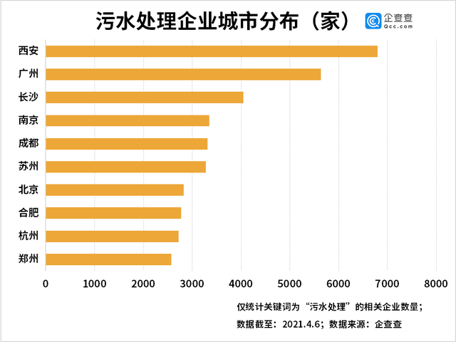 從城市分布來(lái)看,企查查數(shù)據(jù)顯示,西安的污水處理相關(guān)企業(yè)數(shù)量最多,共6798家,在所有城市中排名第一。排名2-5位的廣州、長(zhǎng)沙、南京和成都,分別有污水處理企業(yè)5639家、4044家、3353家和3314家。