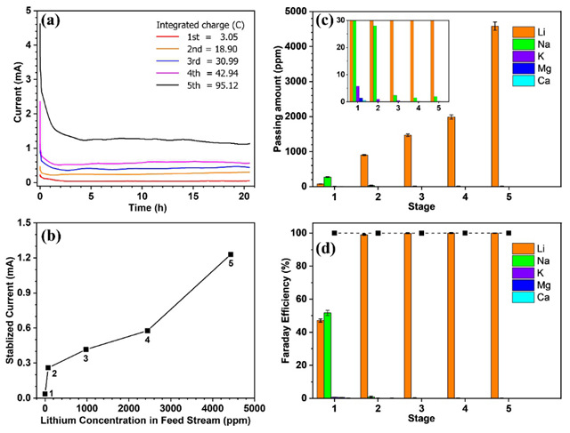 圖2.(a)提鋰過程中每一級的計時電流曲線,曲線與時間的積分即為該過程中遷移的總電荷量;(b)提鋰過程中穩(wěn)定電流與原料鋰濃度的關系;(c)提鋰過程中每一級的離子通過量;插圖顯示情節(jié)在低范圍內(nèi),以幫助查看干擾離子的結果:(d)提鋰過程中每一級中不同離子的遷移對電流的貢獻率。實心方塊表示總體效率(100%)。