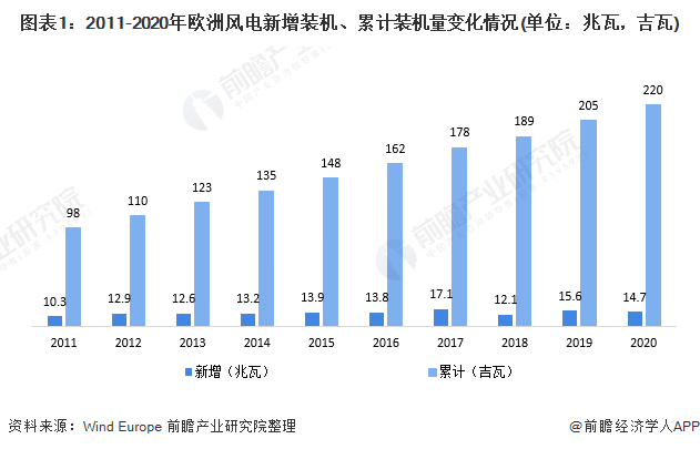 1、2020年歐洲累計(jì)風(fēng)電裝機(jī)量達(dá)220吉瓦