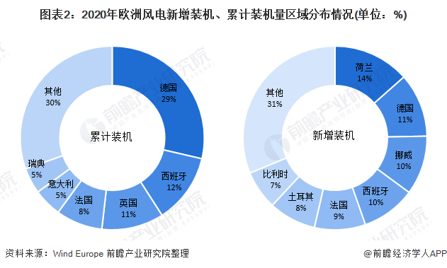 2020年,從累計(jì)裝機(jī)量來看,德國的風(fēng)能裝機(jī)份額排名歐洲第一,達(dá)29%,其次是西班牙、英國,累計(jì)裝機(jī)量份額分別為12%、11%;