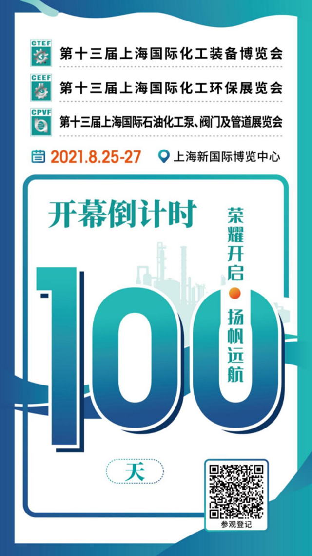 CTEF 2021第十三屆上海國(guó)際化工裝備博覽會(huì)將于2021年8月25日至27日在上海舉行。5月17日,CTEF 2021倒計(jì)時(shí)100天。